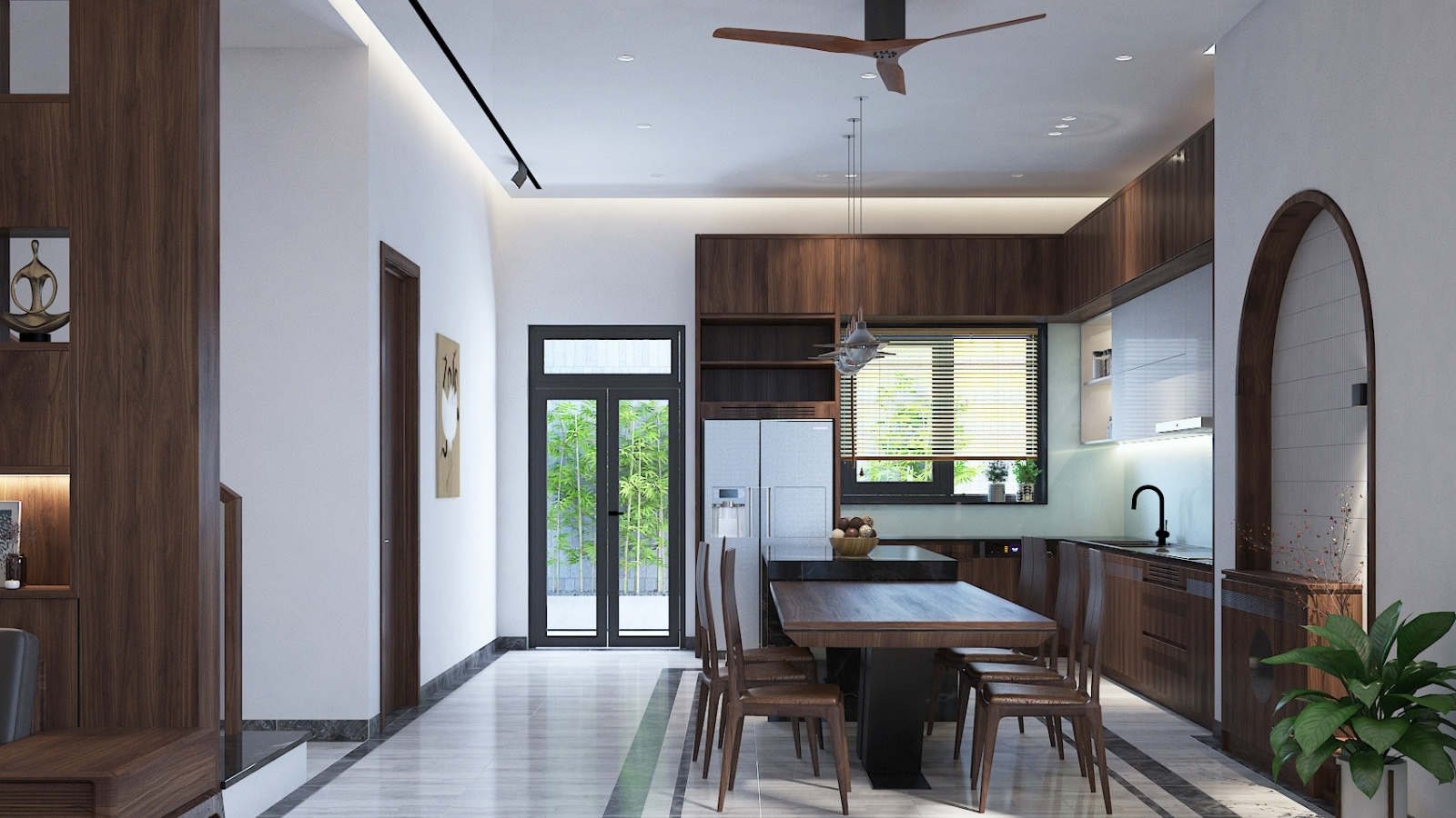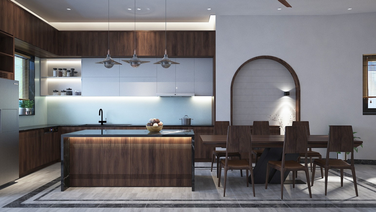Đi tiếp vào khu vực bếp – ăn, tông nâu trầm tiếp tục được xuyên suốt, tạo nên sự đồng bộ và kết nối trong toàn bộ dự án thi công nội thất. Bộ tủ bếp gỗ óc chó với thiết kế chữ L rộng rãi, kết hợp mặt đá sáng màu, mang đến sự hiện đại và thuận tiện cho người sử dụng. Bàn ăn gỗ nguyên khối, ghế tựa dáng đơn giản nhưng chắc chắn, tạo điểm nhấn cho không gian sum họp gia đình. Cách bố trí ánh sáng tự nhiên qua những khung cửa lớn giúp khu vực bếp luôn thông thoáng, tươi sáng và tràn đầy năng lượng.