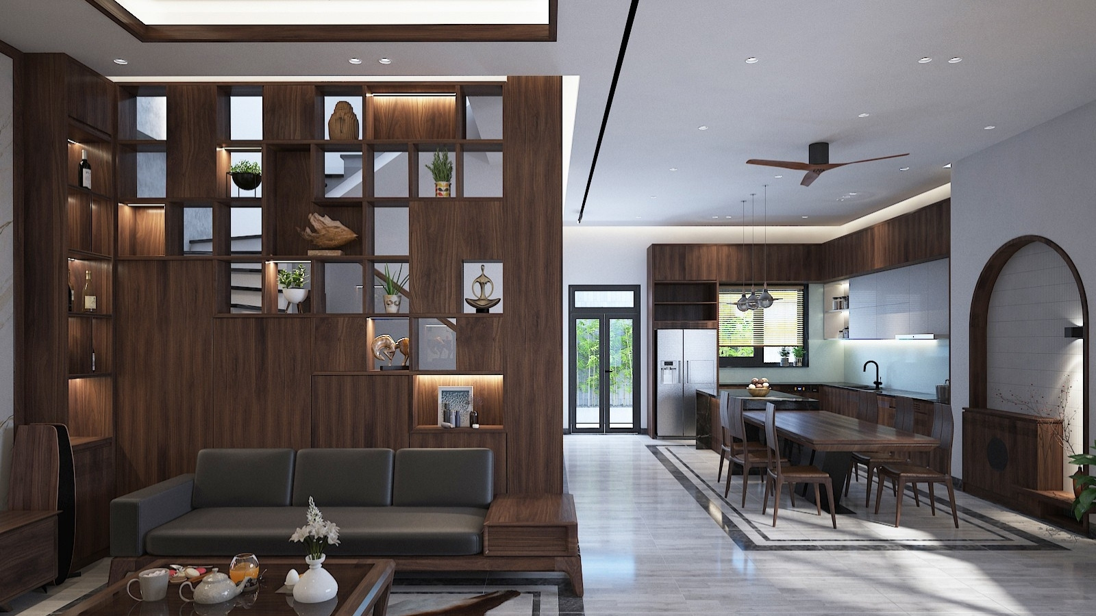 Ngay từ phòng khách, sắc nâu trầm đặc trưng của gỗ óc chó đã mang đến cảm giác ấm cúng, sang trọng và vô cùng gần gũi. Bộ sofa gỗ óc chó với đường vân mềm mại, bề mặt xử lý mịn và độ bền vượt trội trở thành tâm điểm của không gian. Hệ tủ trang trí lớn dạng ô mở, chạy dọc theo chiều cao căn phòng, giúp không gian thêm chiều sâu và sự cuốn hút. Ánh sáng âm tủ được bố trí khéo léo, tạo hiệu ứng lung linh cho các món decor và tăng chiều sâu thẩm mỹ.