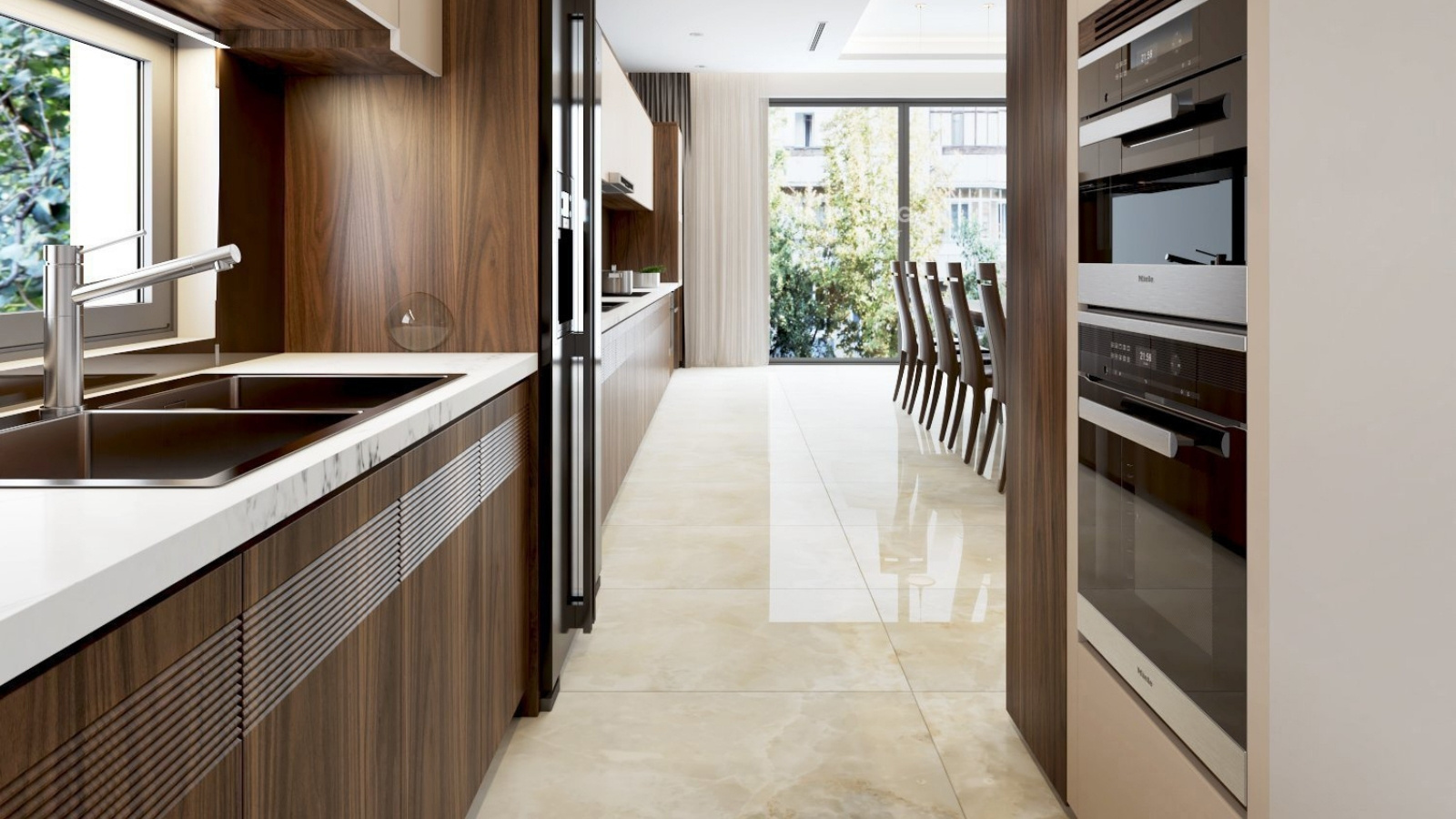 Trong khu vực phòng ăn và phòng khách liên thông, chất liệu gỗ óc chó được khai thác trọn vẹn sự quý phái vốn có. Mặt bàn ăn được giữ nguyên những đường vân xoáy mềm mại, đậm nét tự nhiên – dấu ấn đặc trưng tạo nên giá trị độc bản mà không loại gỗ nào có thể thay thế. Bộ ghế đồng bộ, thiết kế bo cong tinh tế, mang đến sự thoải mái và cảm giác nâng niu khi sử dụng. Từng chi tiết đều được chăm chút bằng kỹ thuật gia công tỉ mỉ, chuẩn mực thẩm mỹ của những sản phẩm hướng đến phân khúc cao cấp.