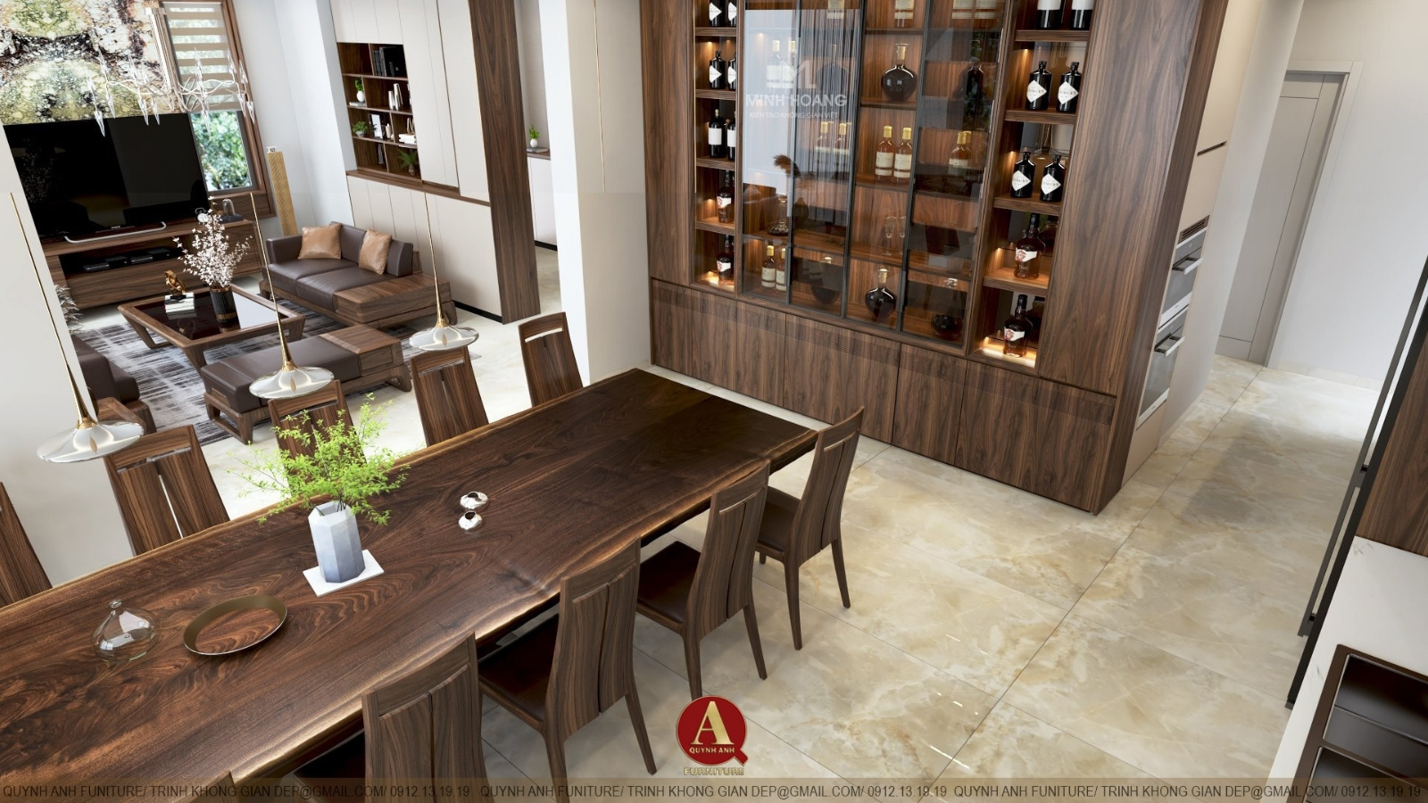 Nội thất Quỳnh Anh mang đến không gian Splendora không chỉ bằng kỹ thuật sản xuất hiện đại, mà còn bằng triết lý thẩm mỹ đề cao sự độc bản – mỗi sản phẩm là một câu chuyện riêng, được đo ni đóng giày theo phong cách sống của gia chủ. Sự hiện diện của gỗ óc chó trong toàn bộ không gian là tuyên ngôn của đẳng cấp, của sự tinh tế và của những người luôn tìm kiếm vẻ đẹp bền vững theo thời gian.