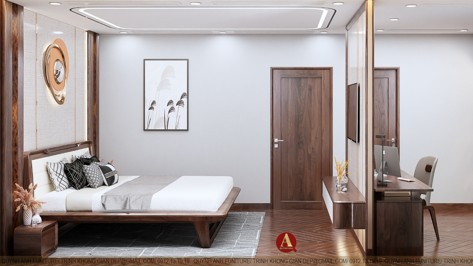 Phòng ngủ master được hoàn thiện với tinh thần tối giản nhưng sang trọng. Giường ngủ gỗ óc chó dáng thấp, đường cong mềm mại tạo cảm giác nhẹ nhàng và an yên. Tab đầu giường, bàn làm việc và tủ quần áo được đồng bộ cùng chất liệu, tôn lên sự hài hòa và cao cấp. Mảng tường đầu giường sử dụng bố cục thanh nhã kết hợp tranh nghệ thuật và điểm nhấn ánh vàng tinh tế, tạo nên bầu không khí thư giãn nhưng đầy tính thẩm mỹ. Tất cả được sắp đặt nhằm mang lại trải nghiệm nghỉ ngơi hoàn hảo, đúng chuẩn phong cách sống thượng lưu.